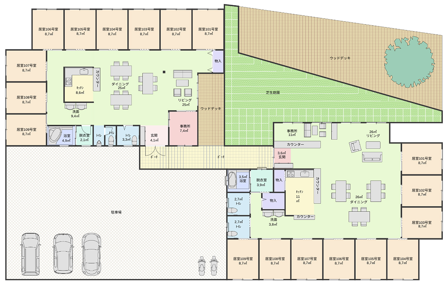 - 少人数制(入居者様9名×2ユニット)計18名で家庭的な暮らし